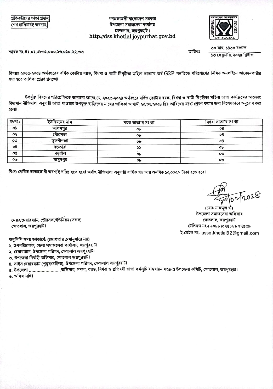 ২০২৩-২০২৪ অর্থবছরের বর্ধিত কোটায় বয়স্ক, বিধবা ও স্বামী নিগৃহীতা মহিলা ভাতা’র অর্থ G2P পদ্ধতিতে পরিশোধের নিমিত্ত অনলাইনে আবেদনকারীর মধ্য হতে তালিকা প্রেরণ প্রসঙ্গে।
